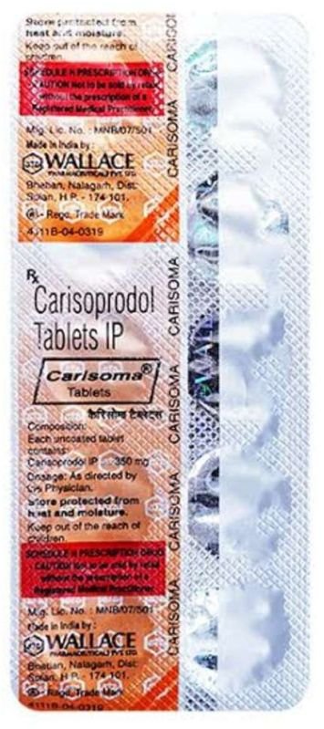 Carisoma 350mg Carisoprodol Tablets by Wallance is a muscle relaxant in tablet form. Each white tablet contains 350mg of Carisoprodol as the active ingredient. Packaged in a box with a shelf life of 2 years, this product is designed to provide effective relief for muscle pain and discomfort.